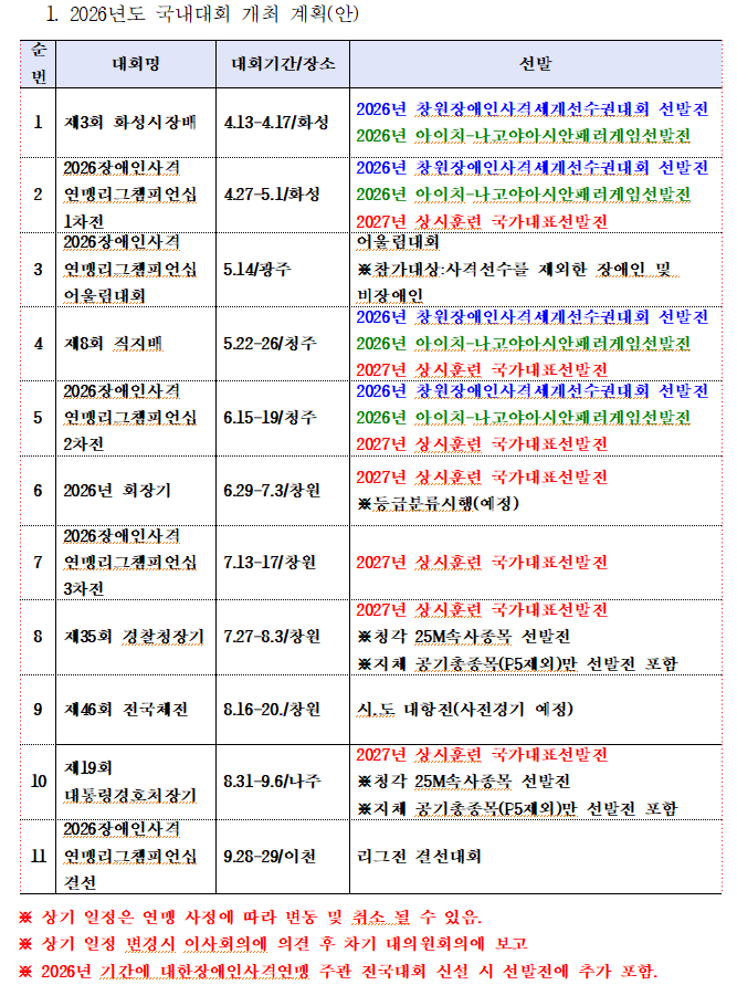 현재 대한장애인사격연맹이 금년도 리그전 사업에 공모한 상태로, 아직 최종 확정 공문을 접수하지 못하여 2026년도 대회 일정 안내가 다소 지연되고 있습니다.